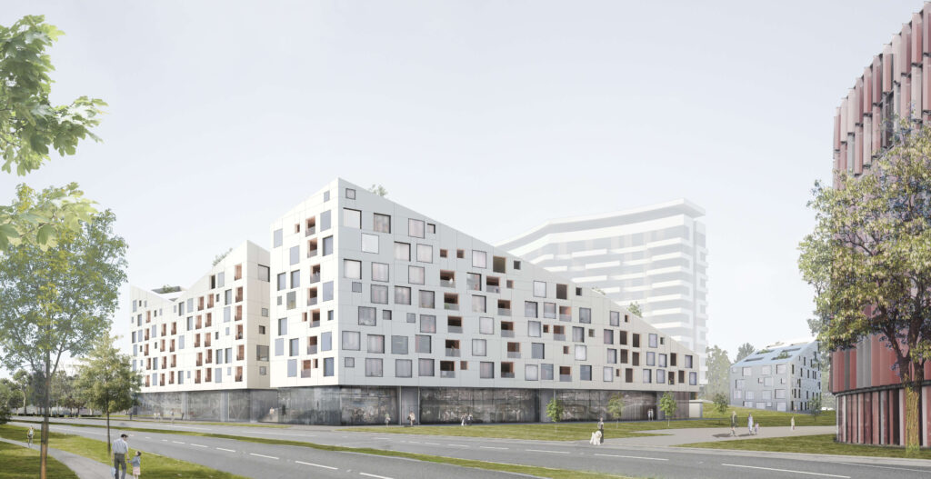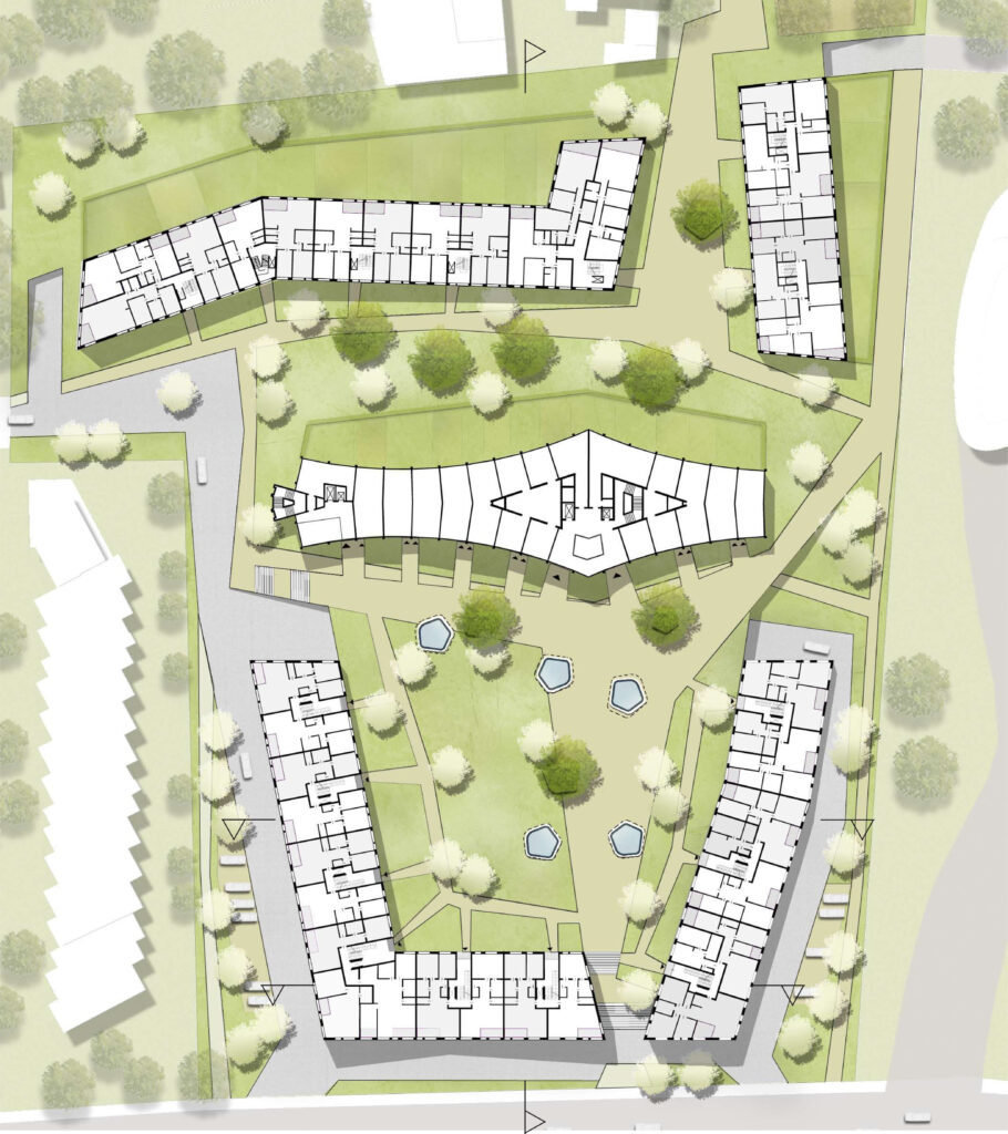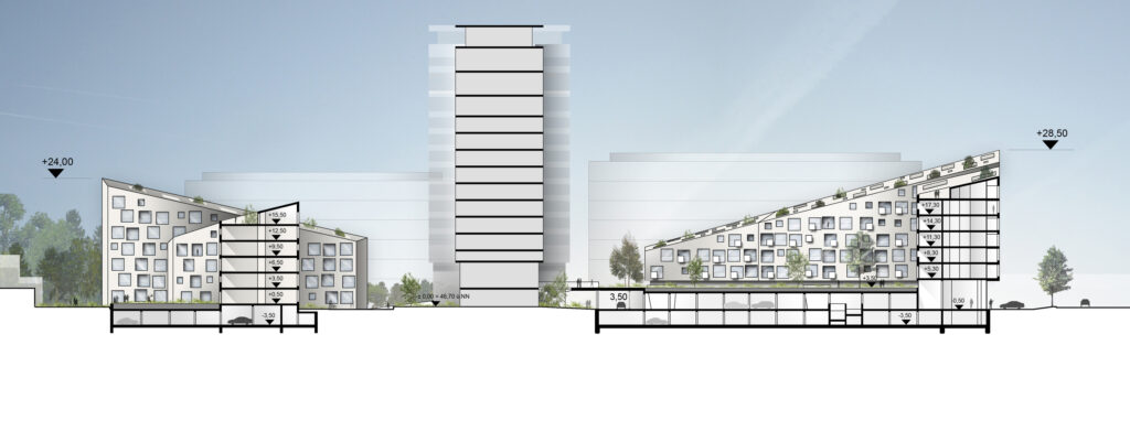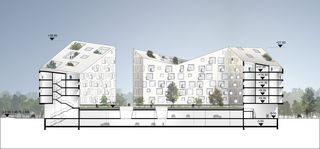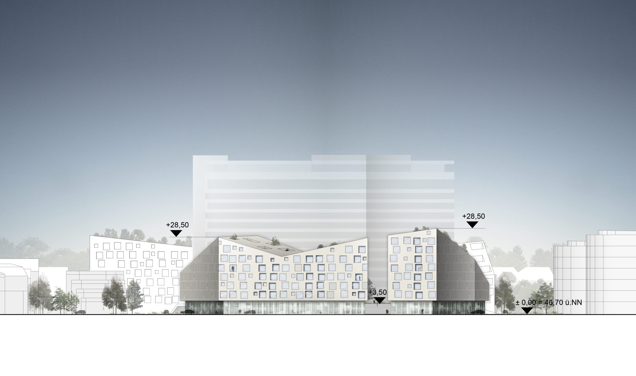 Description Ce concours pour la densification d’une parcelle au bord du Rhin dans le quartier Bayental près du centre de Cologne porte sur la réalisation d’un ensemble mixte de logements et de bureaux. La situation urbaine très hétérogène qui environne le site est marquée par la présence sur la parcelle d’un immeuble de bureau existant qui sera restauré pour l’habitat dans le cadre du projet. La nouvelle composition propose d’optimiser et de structurer cet espace urbain en tirant partie de la situation privilégiée en bord du Rhin.
