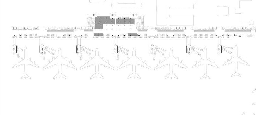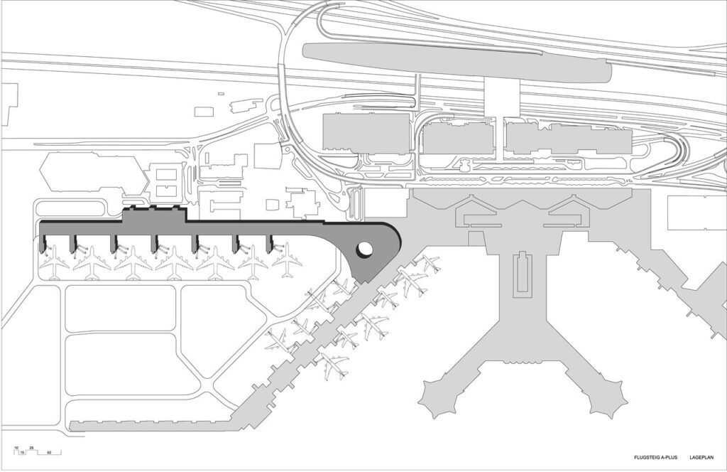 Description Projet issu de la proposition lauréate de GMP au concours (2006) pour la réalisation du nouveau terminal de l’aéroport de Francfort. Le programme de construction comprend les espaces même du terminal: portes et ponts d’embarquement, espaces d’attente et de transit (contrôle de sécurité, contrôles aux frontières, douanes) mais aussi des espaces importants pour le commerce, des espaces d’attente et aussi des bureaux. Le nouveau terminal est spécialement prévu pour l’appontement des Airbus A380. Il est connecté avec le reste de l’aéroport par un volume de commerces et d’espaces de transit. Les enjeux du projets réside dans la pluralité des programmes à l’intérieur d’un même volume, de la nécessité d’assurer des flux des passagers et les limites entre les différents espaces : Schengen, non-Schengen, douanes, réservés au staff ou sécurisés.