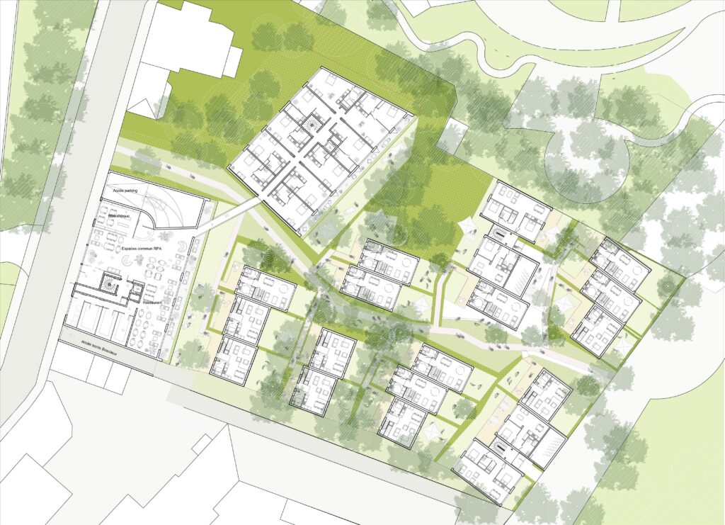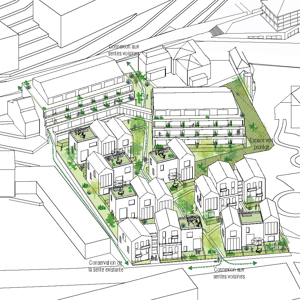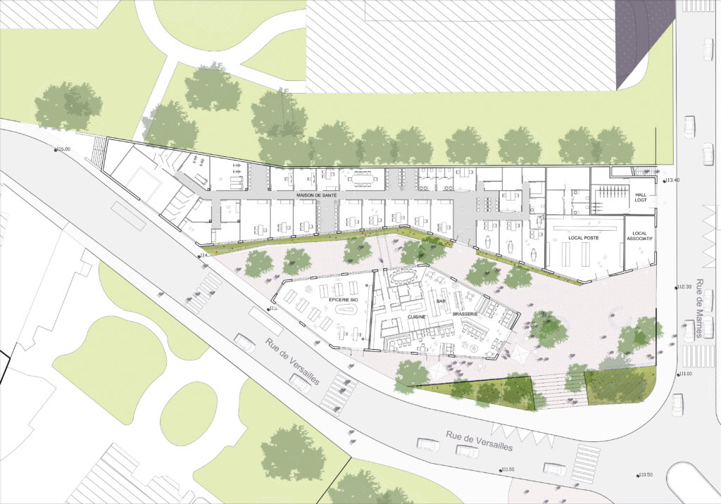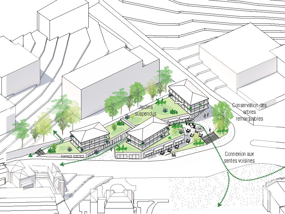 Description Ce projet lauréat pour le concours “Imaginons la Métropole du Grand Paris” porte sur 4 sites à Ville d’Avray dans la région parisienne. L’environnement des sites est à la fois très boisé (forêt de Fausse-Repose et Domaine de Saint-Cloud) mais aussi urbain et directement dans le cœur de la ville. Le programme porte sur la revitalisation du centre-ville avec des typologies variées et de nouveaux services pour les habitants comme un pôle santé, une crèche, des espaces de bureaux et aussi des logements (sociaux, en accession et une résidence pour personnes âgées). Notre travail a été de préserver les sites en réduisant l’imperméabilisation des terrains au maximum et en évitant de supprimer les arbres présents. Les programmes s’insèrent dans des typologies variées: maisons, petits et moyens collectifs ou bâtiments mixtes. Ce projet met l’accent sur des systèmes constructifs bas carbone (ossature et bardage bois, structure hybride bois-béton,..).
