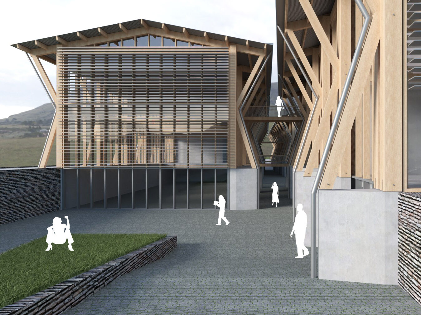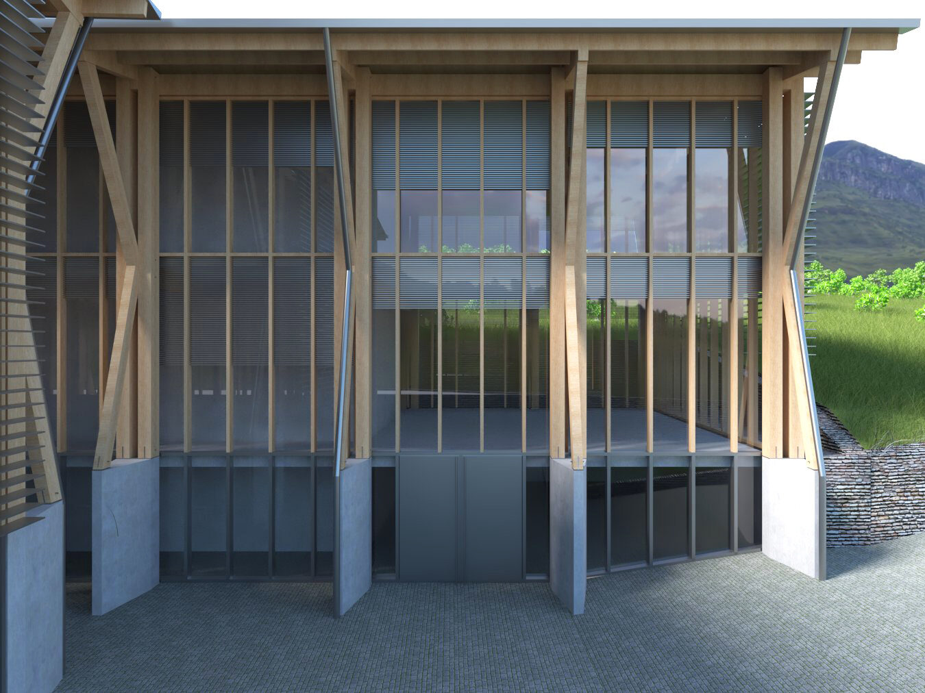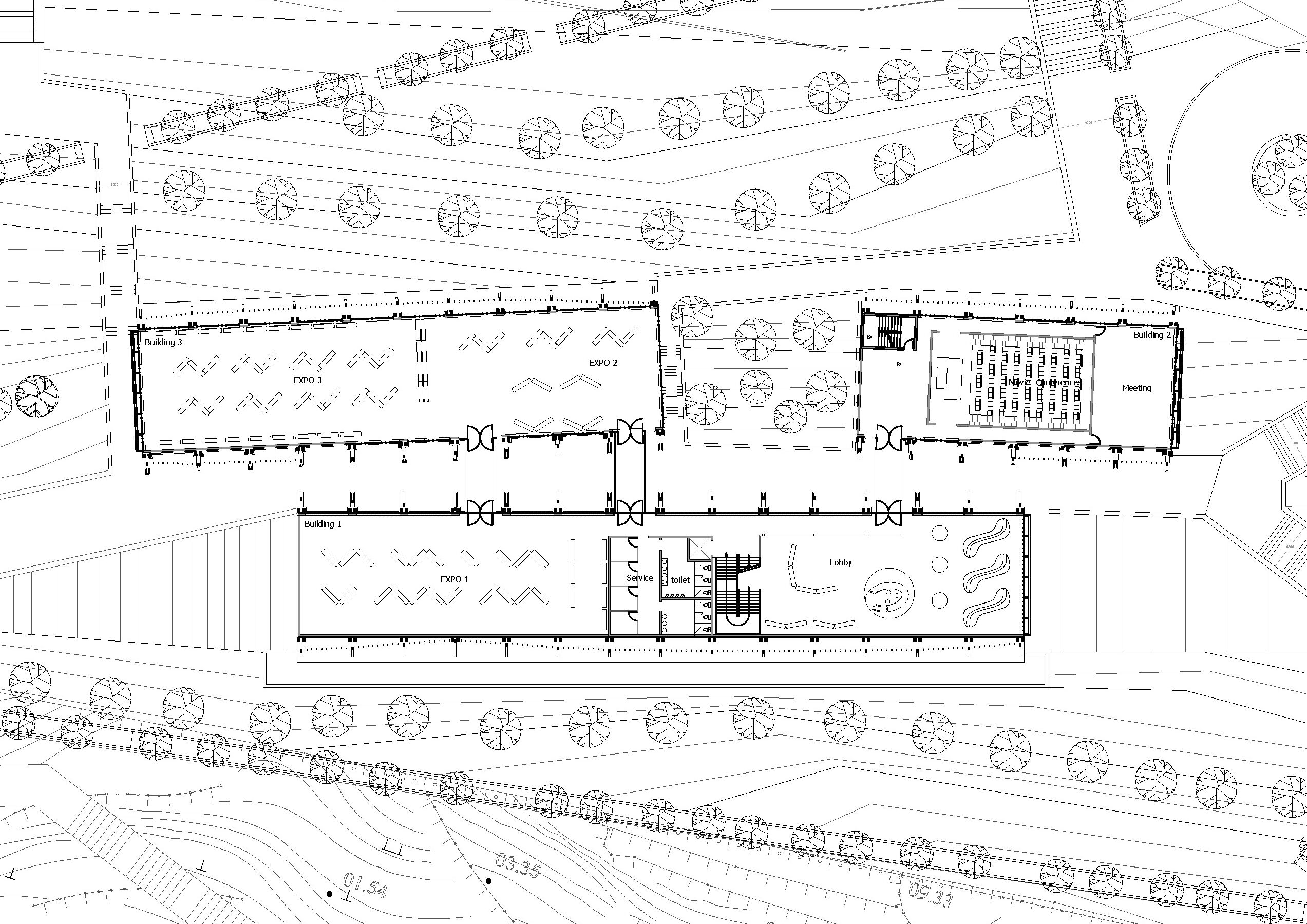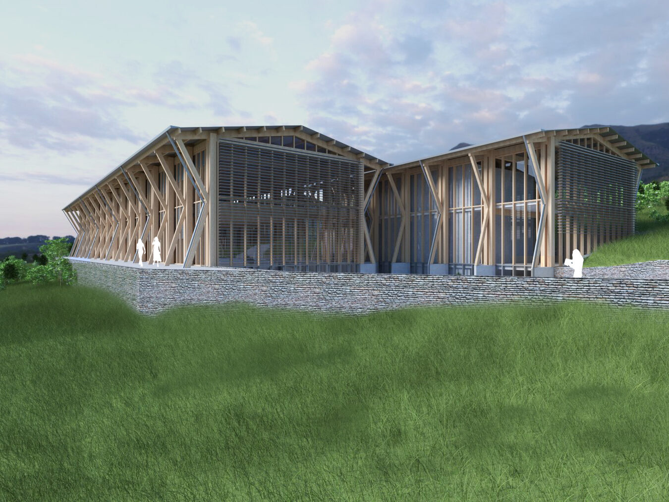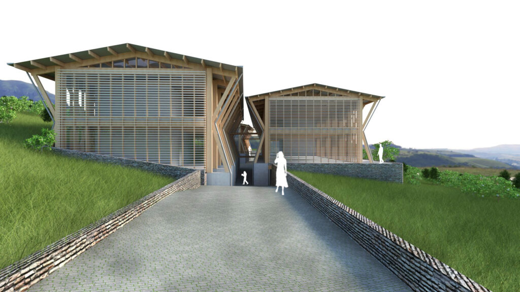Programme musée avec salles d’exposition et auditorium. Aménagements paysagers dans la pente du site