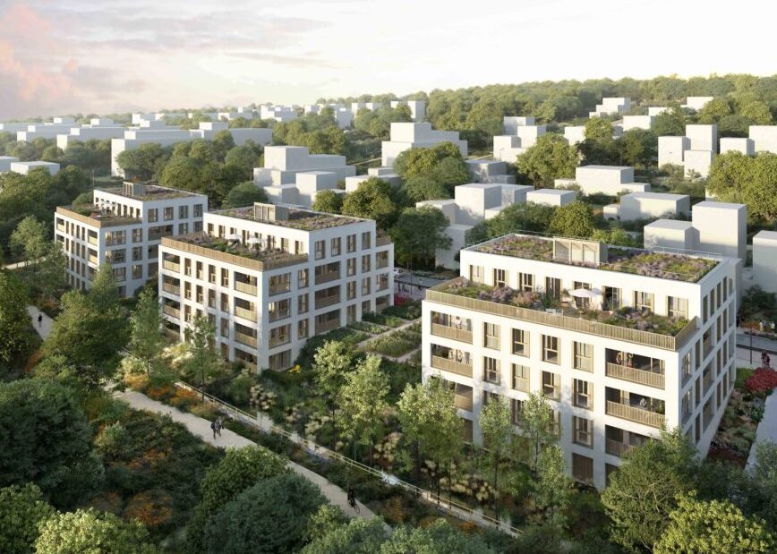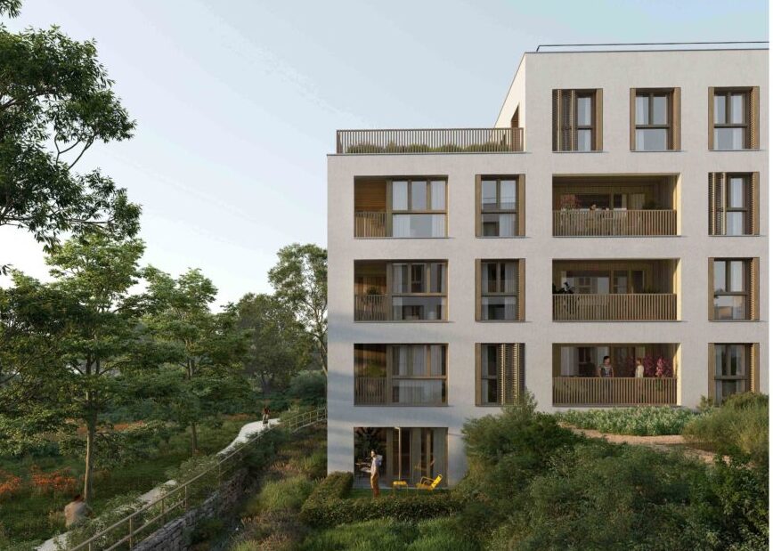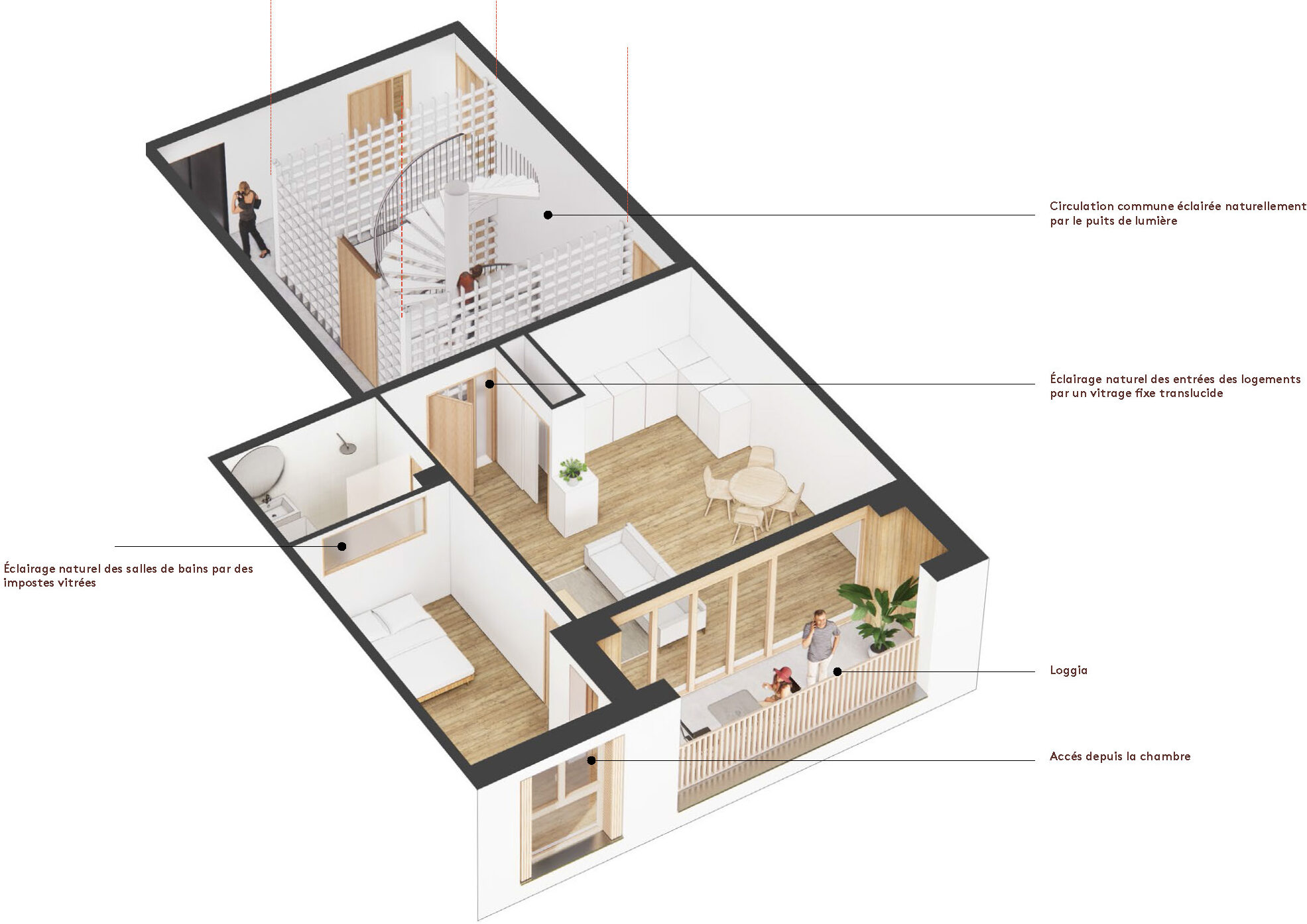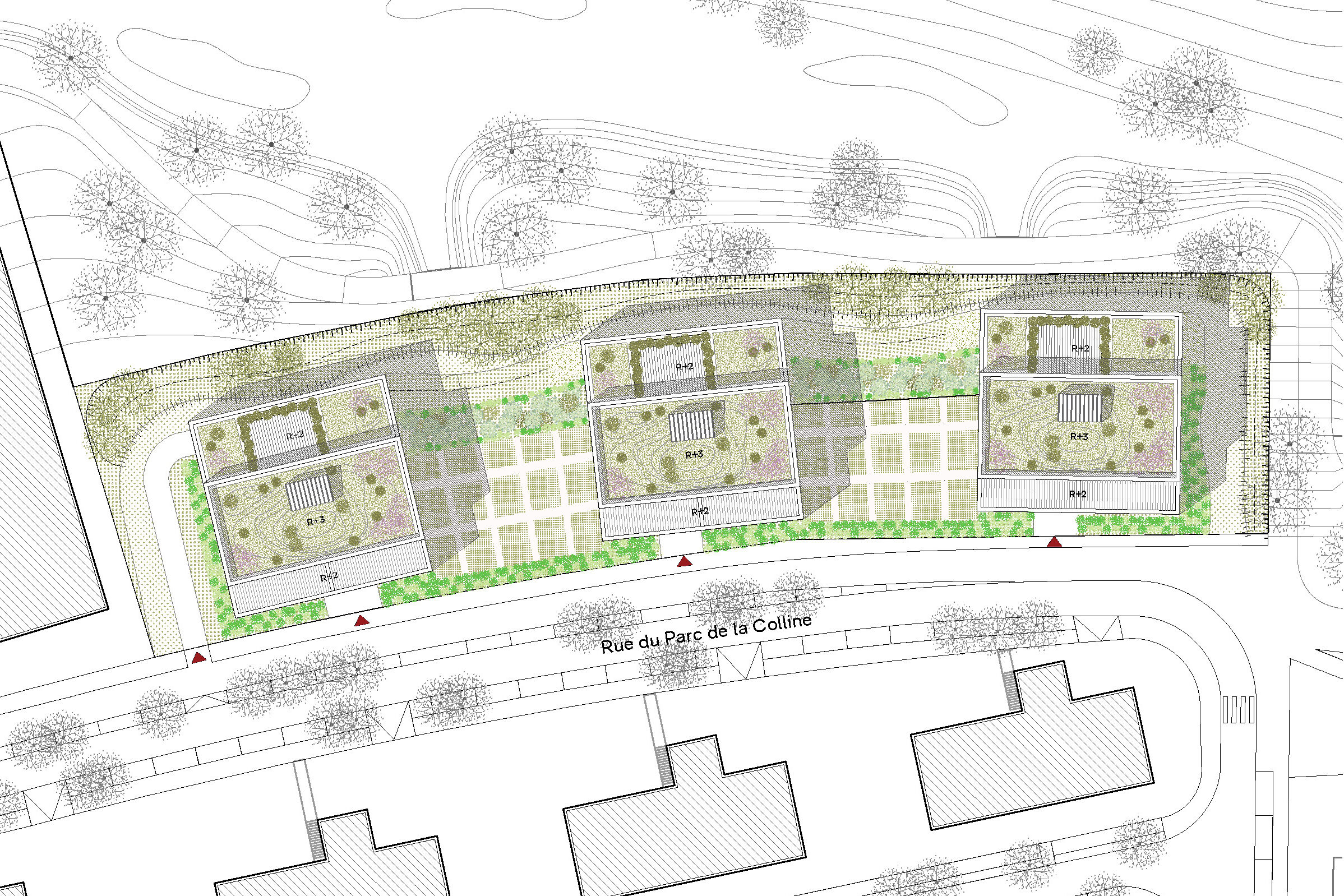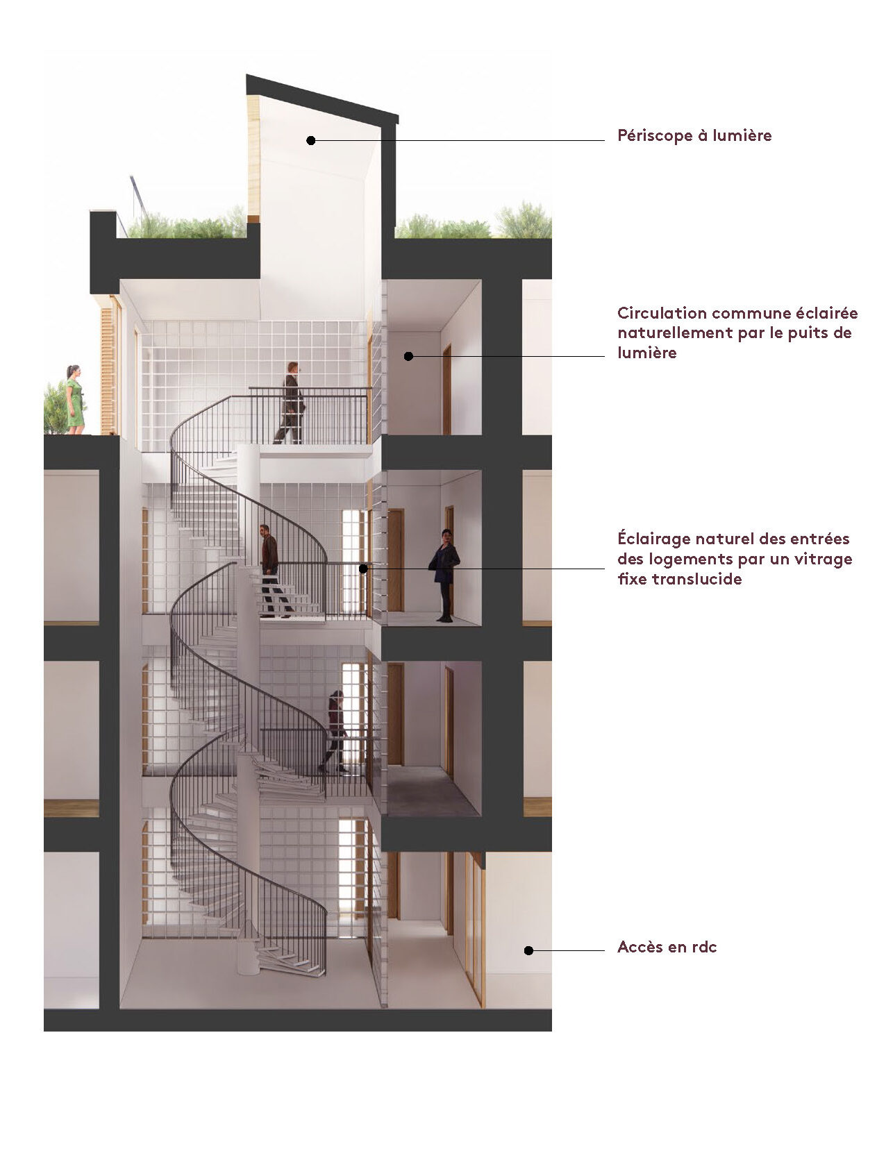 Description ces 3 bâtiments de logements collectifs en limite urbaine de la ville de Torcy s’insèrent dans le paysage des prairies de bord de Marne. L’intention est de créer un projet à faible impact tant au niveau de son emprise sur le terrain que de son bilan carbone. Une recherche particulière a été développée sur les espaces extérieures végétalisés en RDC, dans la pente naturelle et sur les toitures qui prolongent l’environnement existant. Les volumes habitables s’ouvrent largement sur ce paysage et profitent de double orientation. Les circulations internes sont éclairées naturellement par un puits de lumière qui permet aussi la circulation d’air. Le projet est pensé pour créer des espaces de rencontre entre les habitants avec des jardins communs entre les plots. La construction de ce projet ambitionne de dépasser la réglementation environnementale en vigueur et d’avoir majoritairement recours à des matériaux biosourcés et locaux (bois d’île de France notamment). Façade Ossature Bois, Plancher en bois lamellé-croisé, Noyaux verticaux en béton.