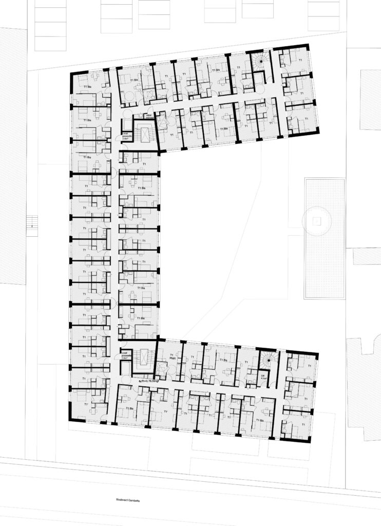 Description Ce projet de reconstruction d’une résidence sociale à Sannois vise à créer des logements plus grands et de meilleur qualité tout en préservant le site existant avec plusieurs arbres de hautes tiges. Le concours en conception-réalisation a permis de préciser les enchainements du planning de la construction en site occupé afin de limiter les relogements provisoires. Les 287 nouveaux logements sont des T1 et des T1 bis organisés le long de grand couloirs centraux éclairés naturellement. Des espaces collectifs en RDC et un grand jardin intérieur permettent de créer des lieux intermédiaires de sociabilité.